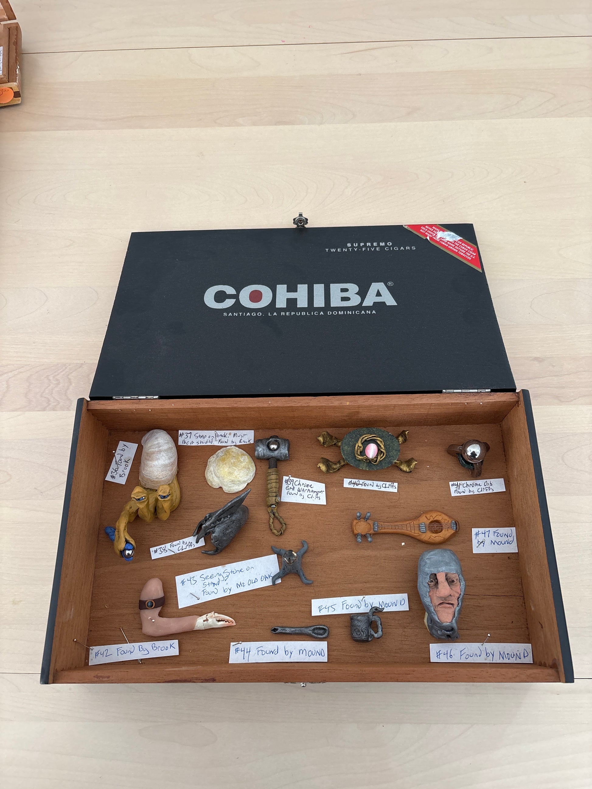 These small sculptures, delicately crafted and housed in an old cigar box, tell the story of a young boy and his collection of magical needful things. A unique and enchanting addition to any space, these sculptures are sure to spark the imagination and bring joy to all who see them.